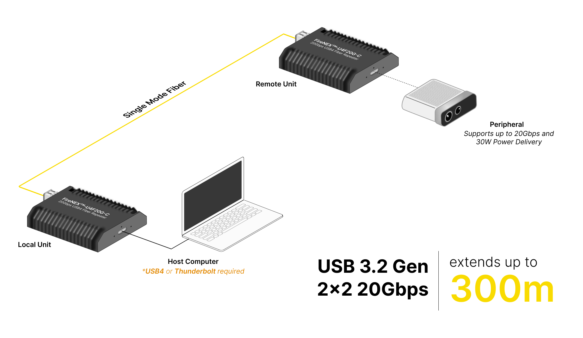 FireNEX™-U4F20G-C is a high-performance USB4 fiber optic repeater for long-distance USB-C connectivity. It connects to USB4 or Thunderbolt 3/4/5 USB-C hosts and transmits signals over EMI-free fiber to a Remote Unit with a single USB 3.2 Gen 2x2 Type-C port supporting up to 20Gbps — delivering the full bandwidth over one USB-C connection.
